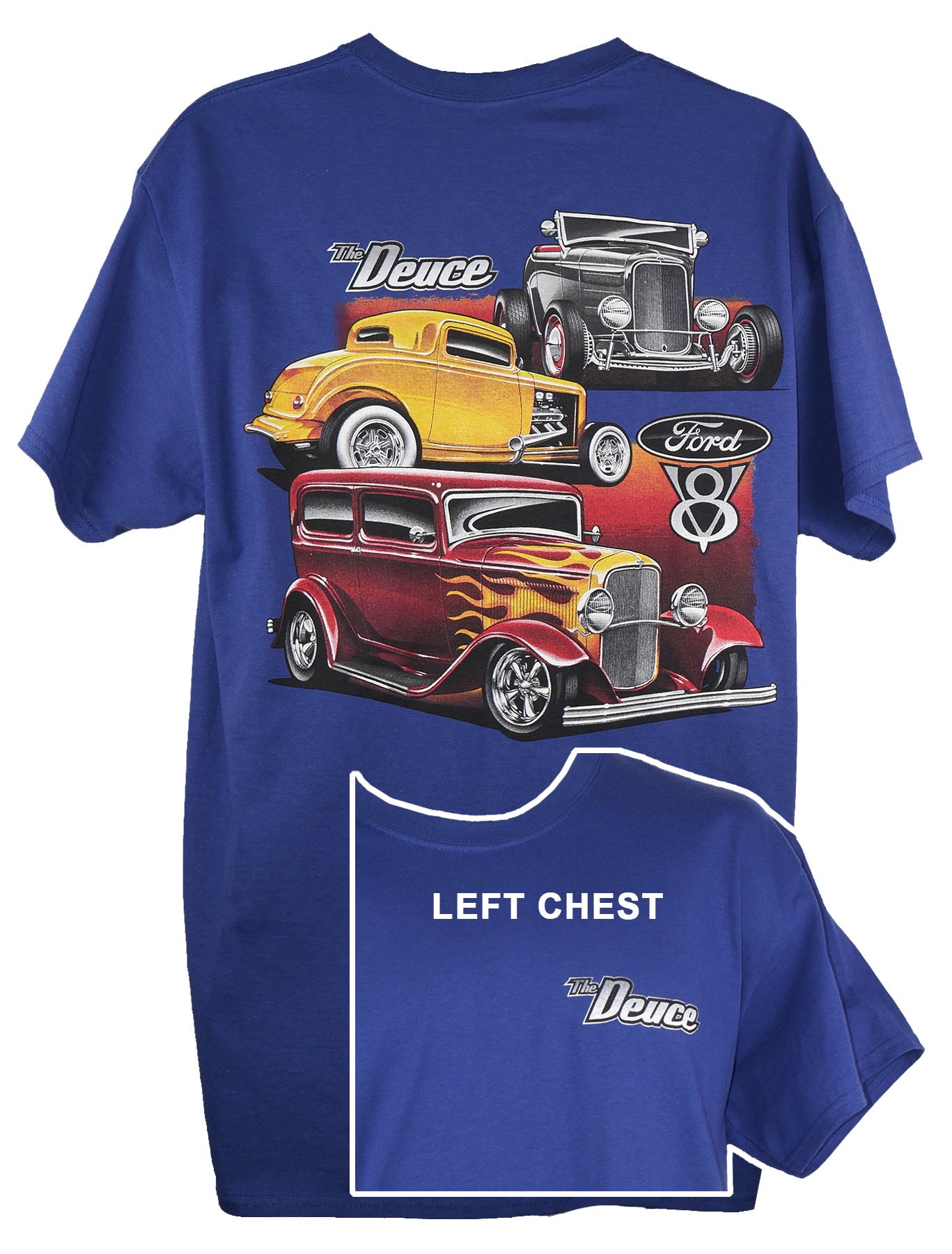 Classic Mustangs with the engine designators printed on the back of a 100% cotton heather navy t-shirt with the Mustang running horse logo printed left chest.